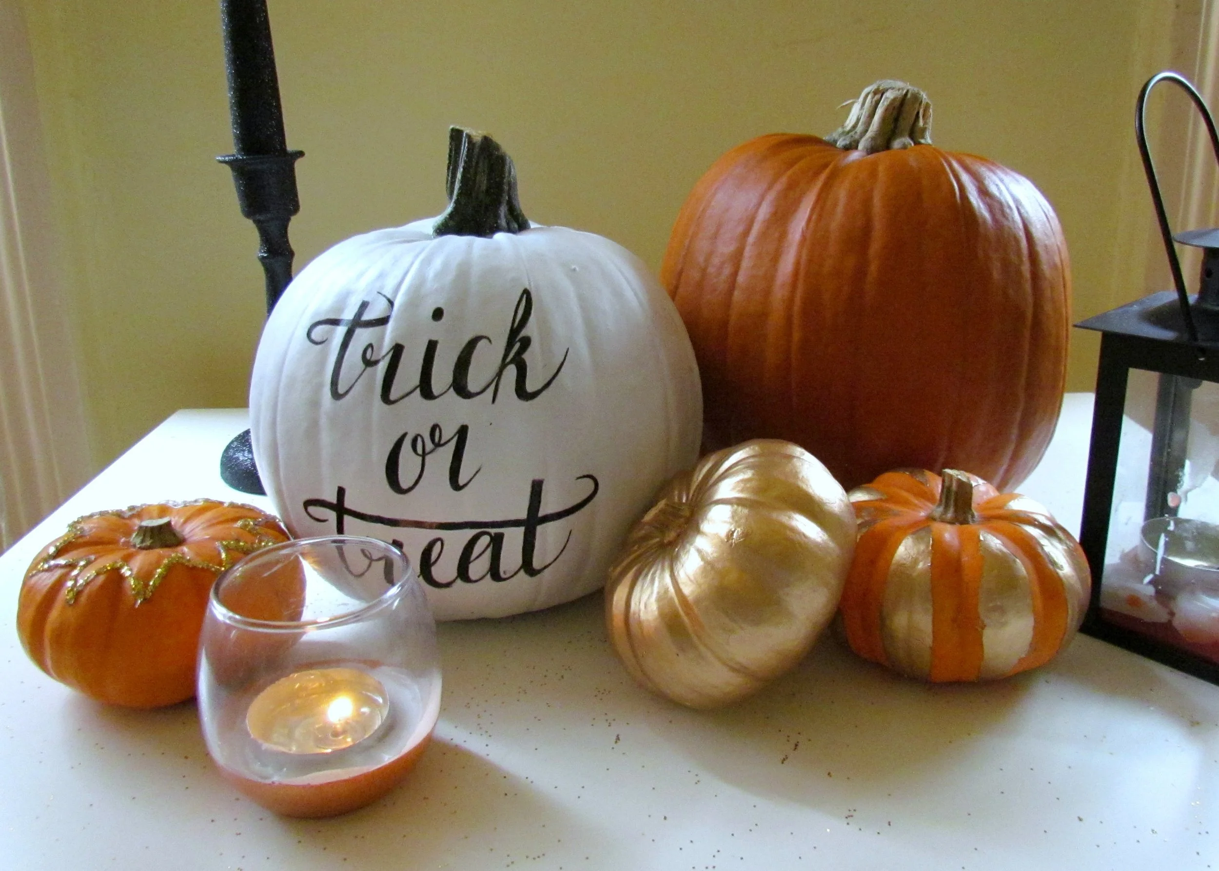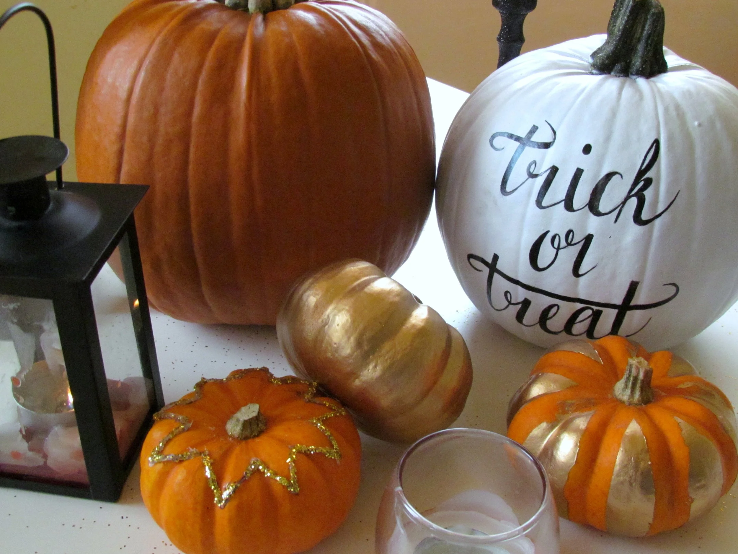 It's that time of year again and where I live, pumpkins are everywhere; every shop has them in stock and even the small green grocers around the corner has them in a variety of different shapes, sizes and colours. If you read my no-mess mumpkin post last year, you'll know I'm not really into carving pumpkins - mine never seem to turn out how I want them too and it's just so messy - so instead I prefer to paint and decorate my pumpkins. As I was having a few friends around to celebrate Halloween this year, I decided to get a few pumpkins and mumpkins in to use as part of my table decor. I'm obsessed with Plasti-Kote spray paint in gold leaf and so decided to spray one mumpkin entirely in gold and another with a striped pattern. They certainly didn't come out perfectly however I actually really like how they have a slightly worn look and they went really nicely with my zig-zag glitter pumpkin and hand-lettered 'trick-or-treat' pumpkin.
