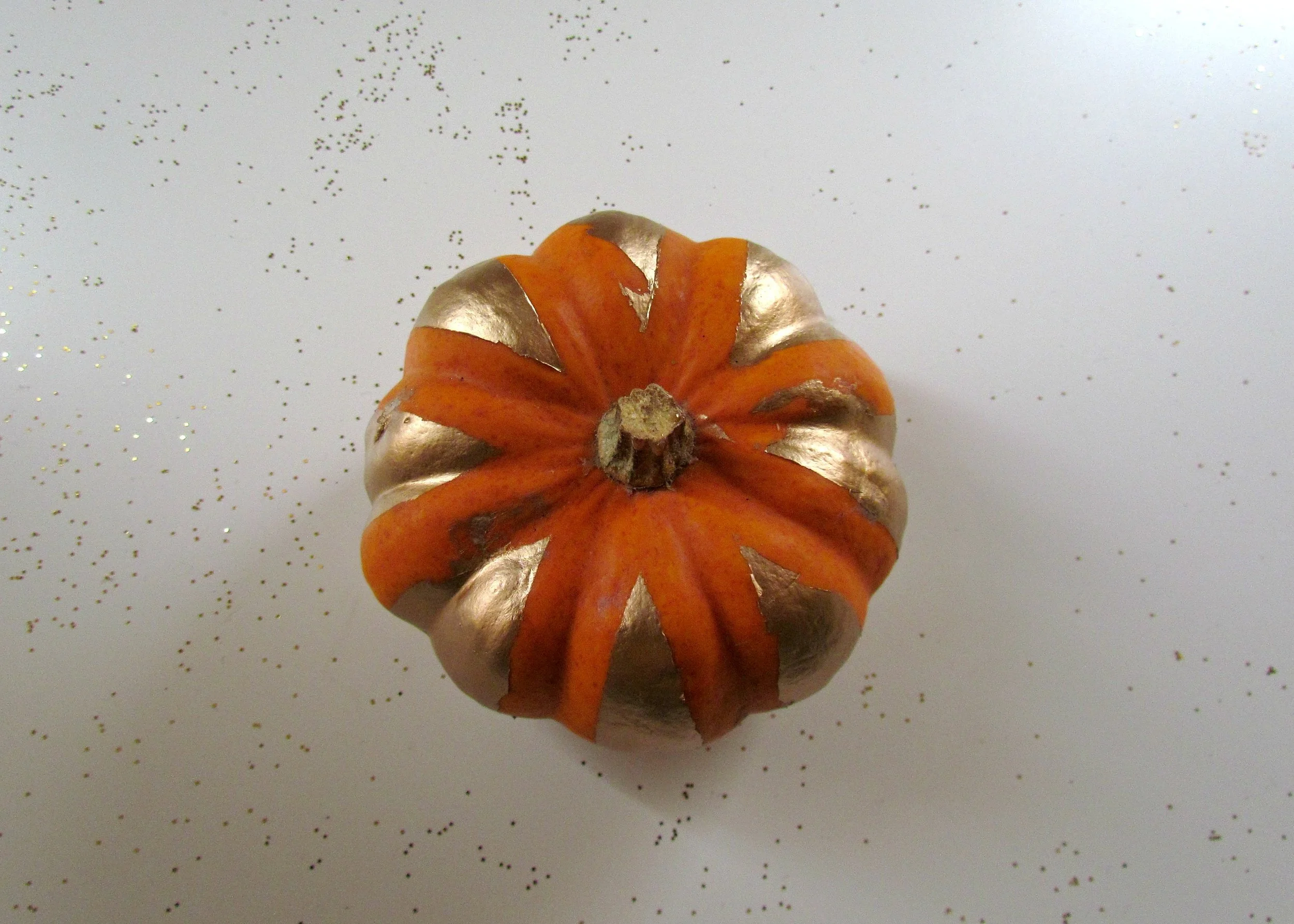 5. Once dry, turn the right way up and spray all over the top with gold paint. With the stalk facing upwards, spray approximately 3cm away from the surface in smooth strokes from the middle of the pumpkin outwards.