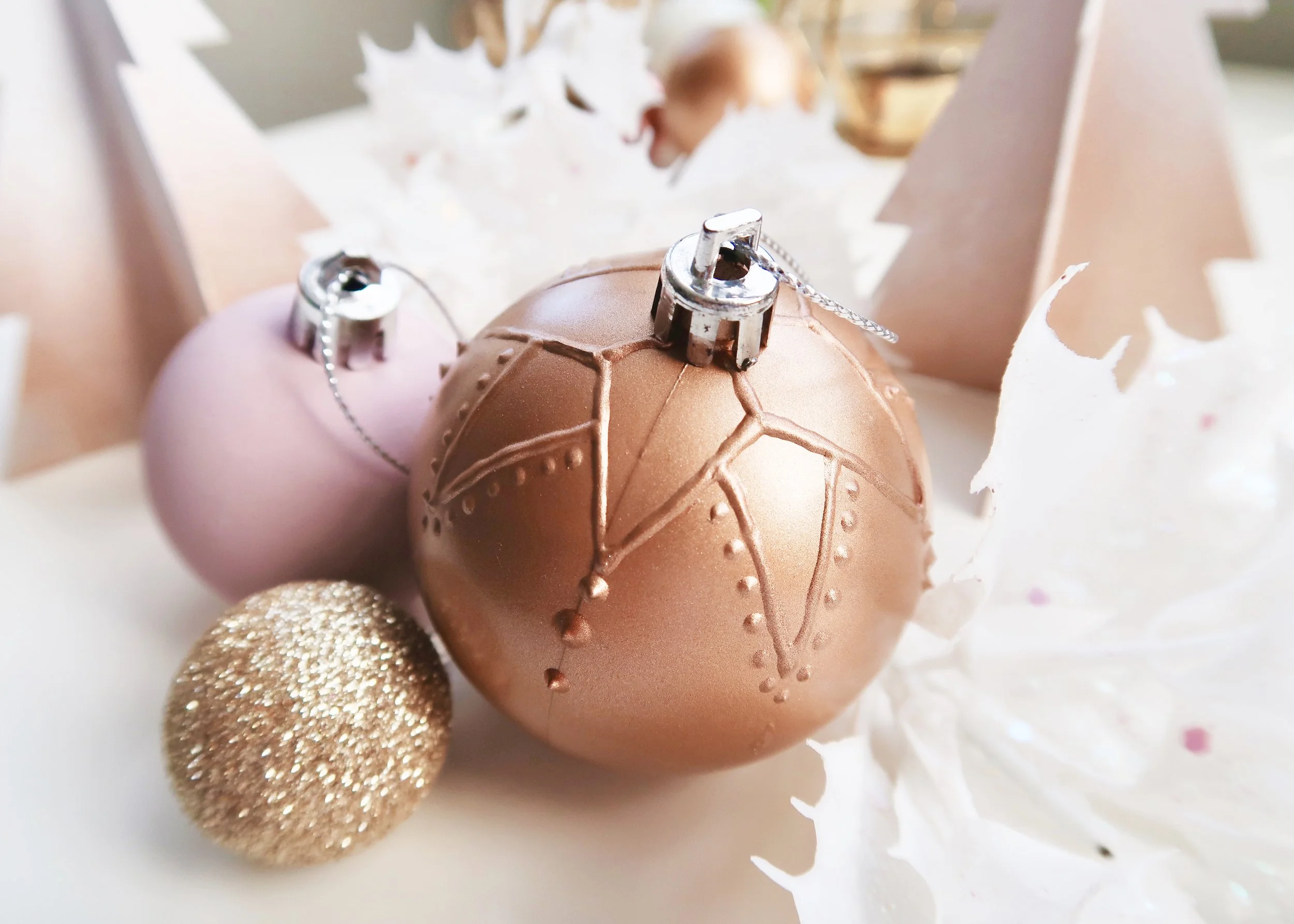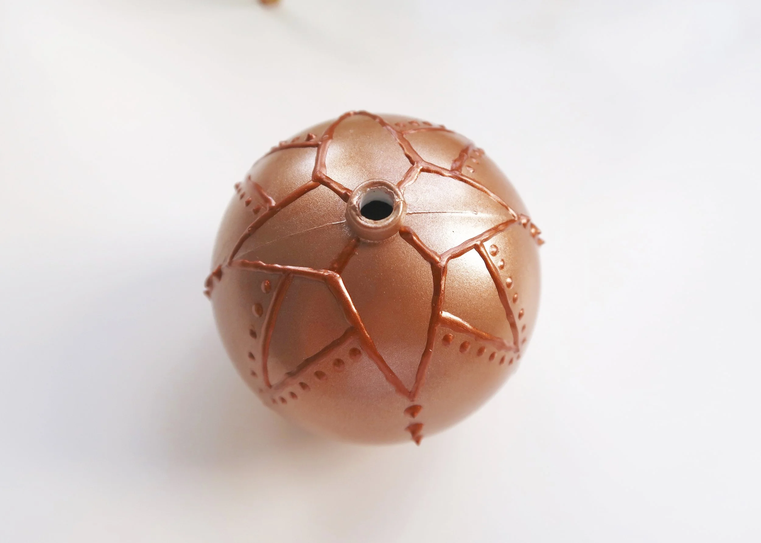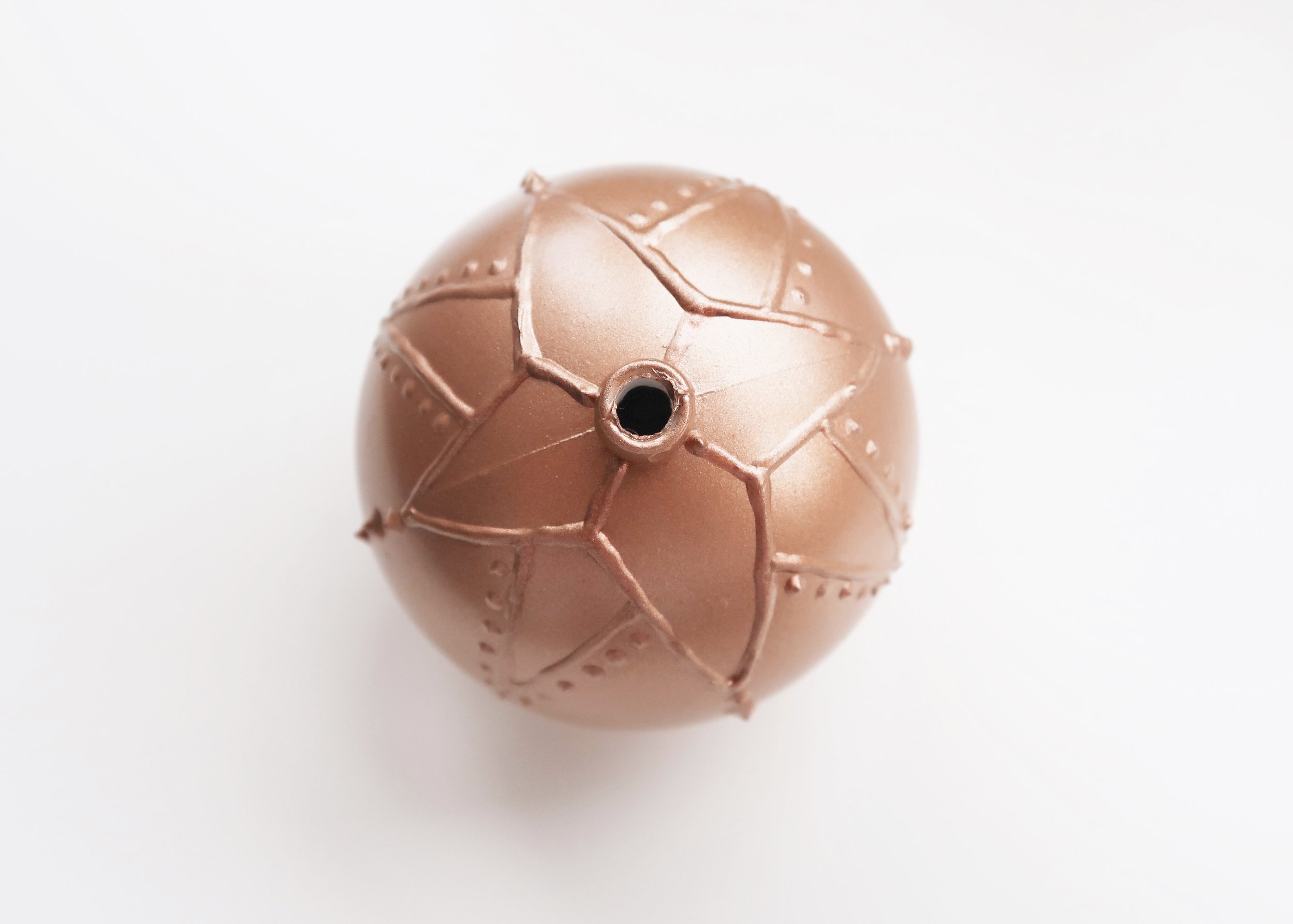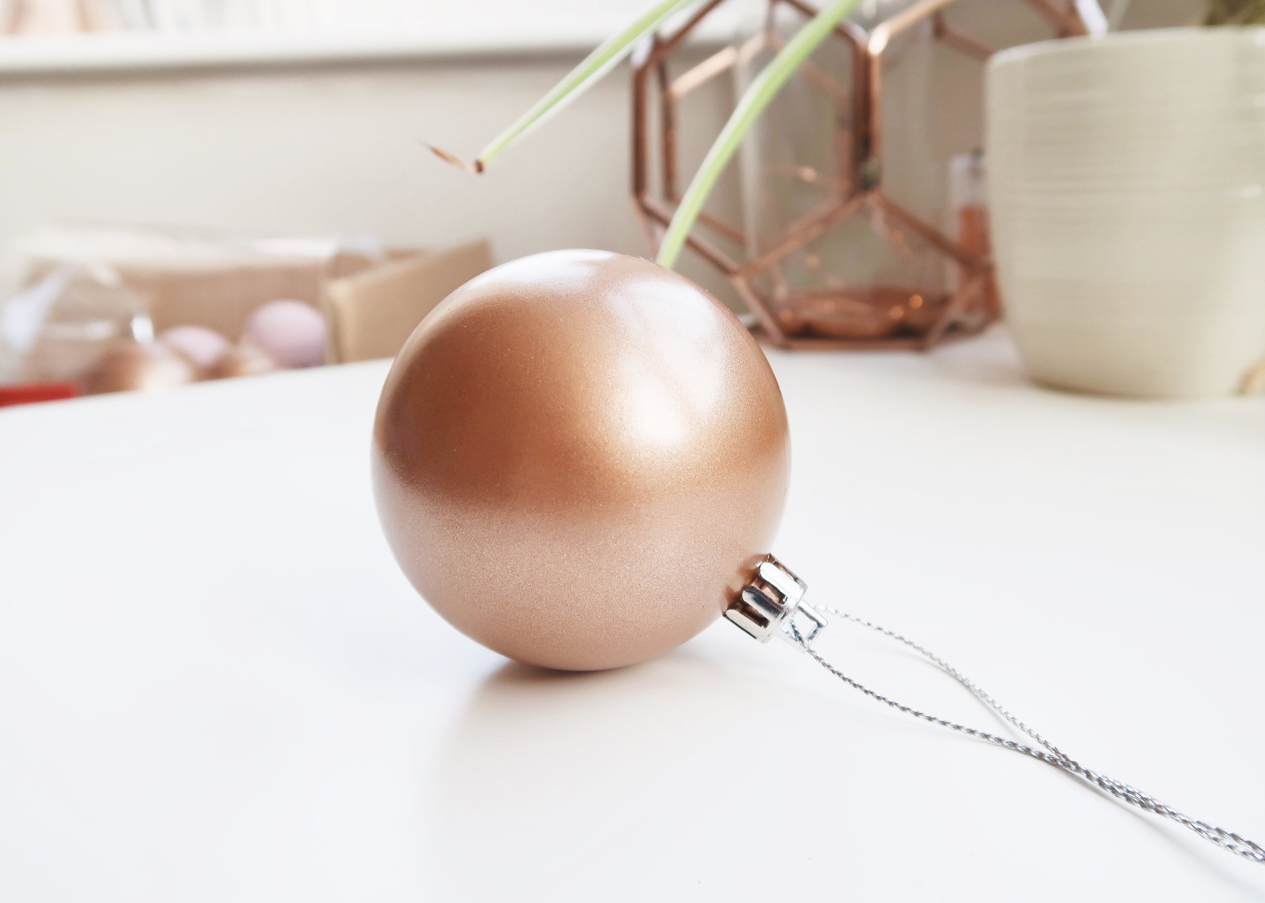 Leave your design to dry completely, before spraying your bauble all over in one colour. I chose to stick with copper (of course) and although I didn’t need to do this step, chose to make the pattern the same colour as the rest of the bauble so that it was more of a ‘textured effect’. Finally, add the cap back on and hang on your tree.