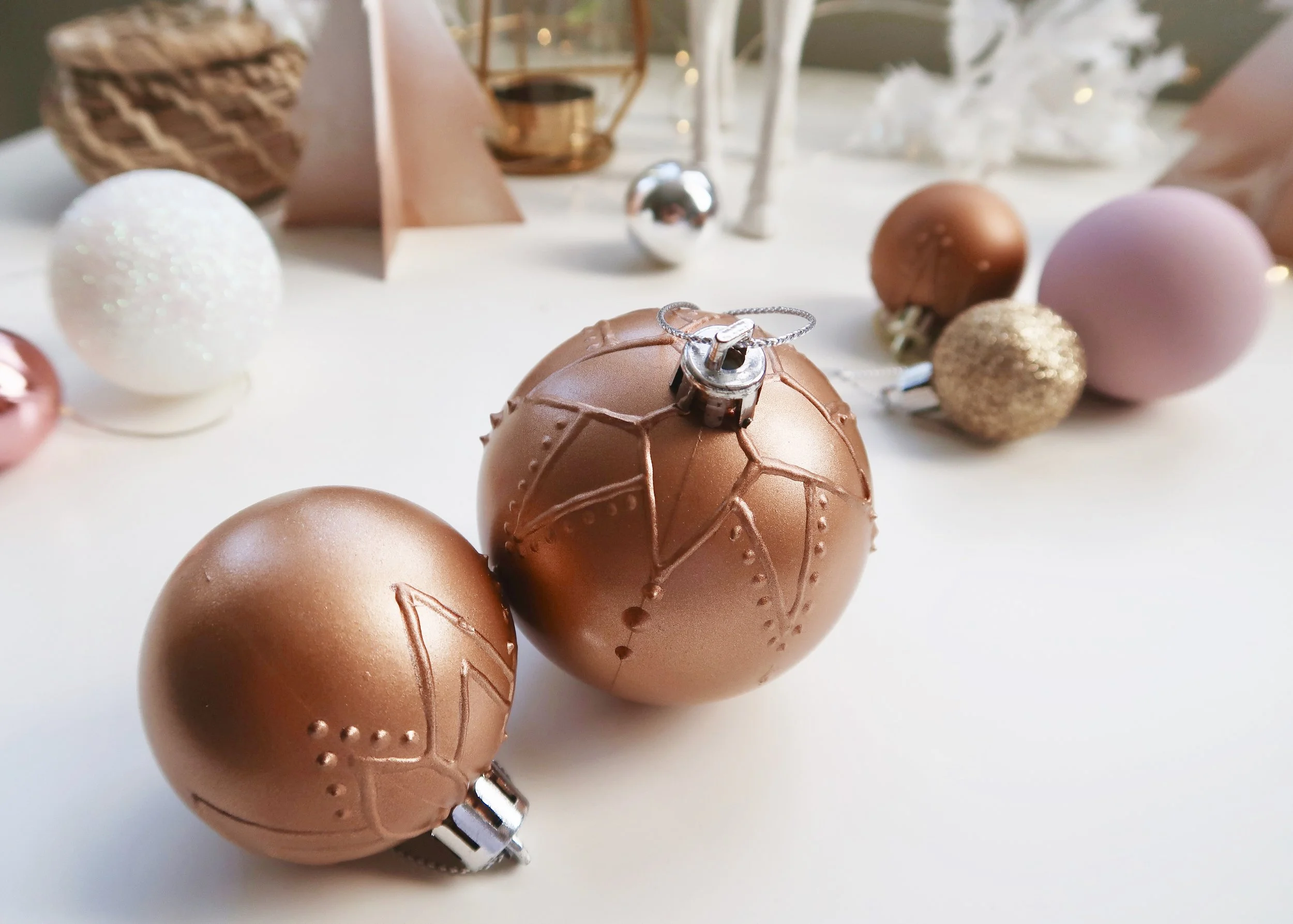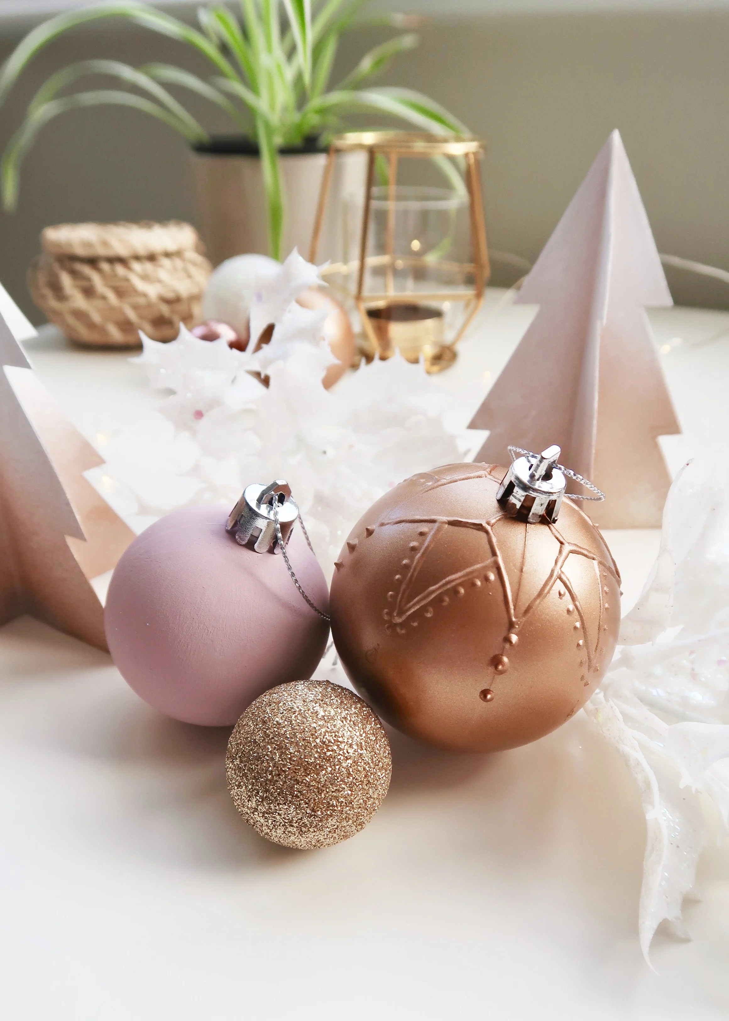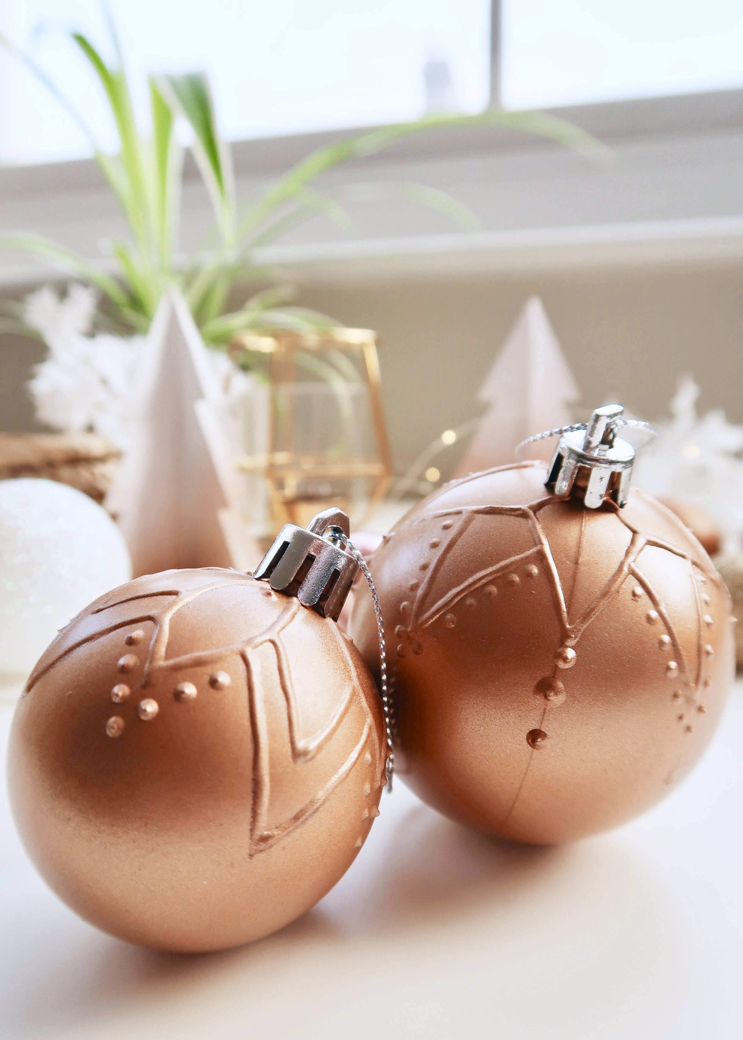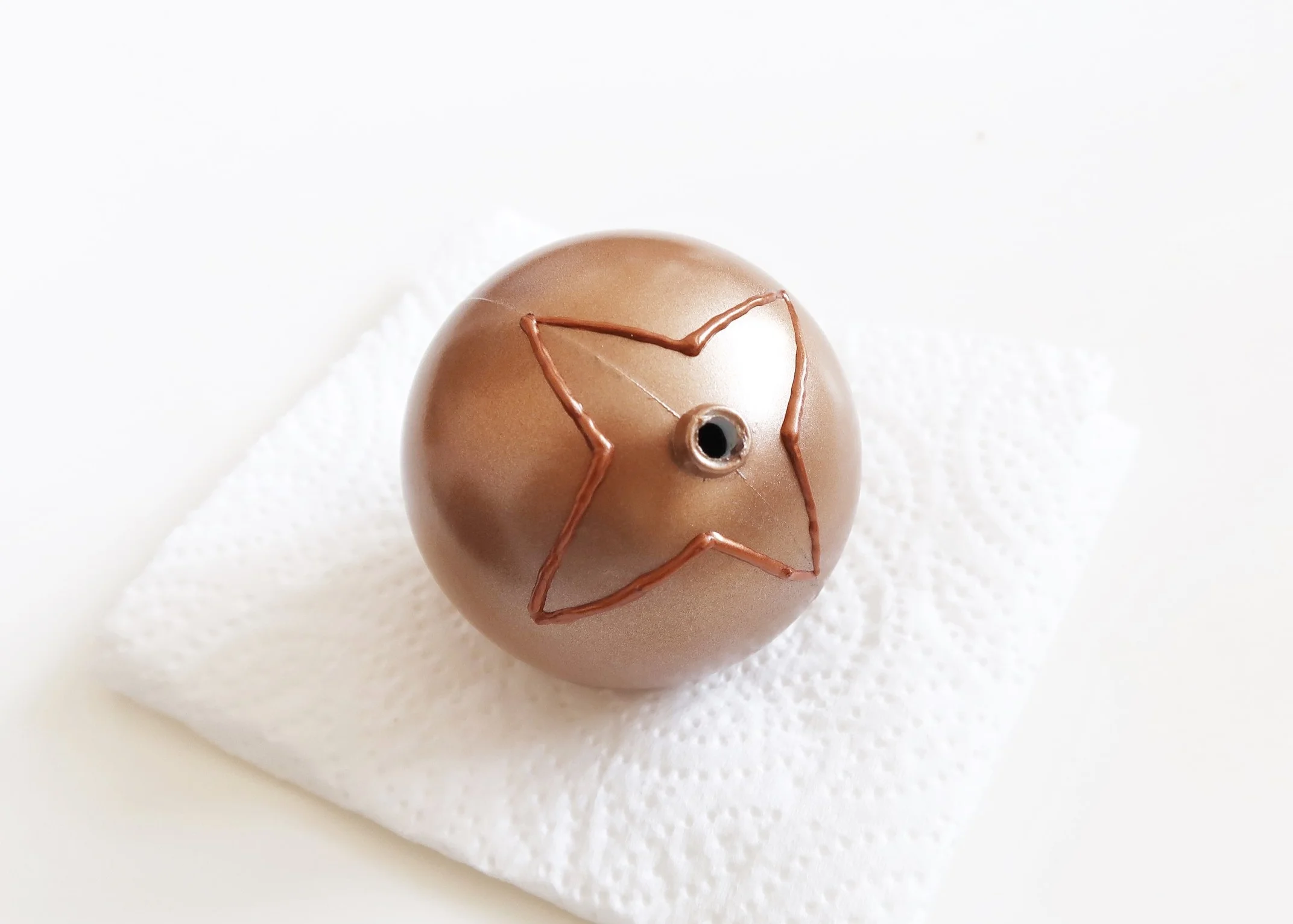 Leave your design to dry completely, before spraying your bauble all over in one colour. I chose to stick with copper (of course) and although I didn’t need to do this step, chose to make the pattern the same colour as the rest of the bauble so that it was more of a ‘textured effect’. Finally, add the cap back on and hang on your tree.