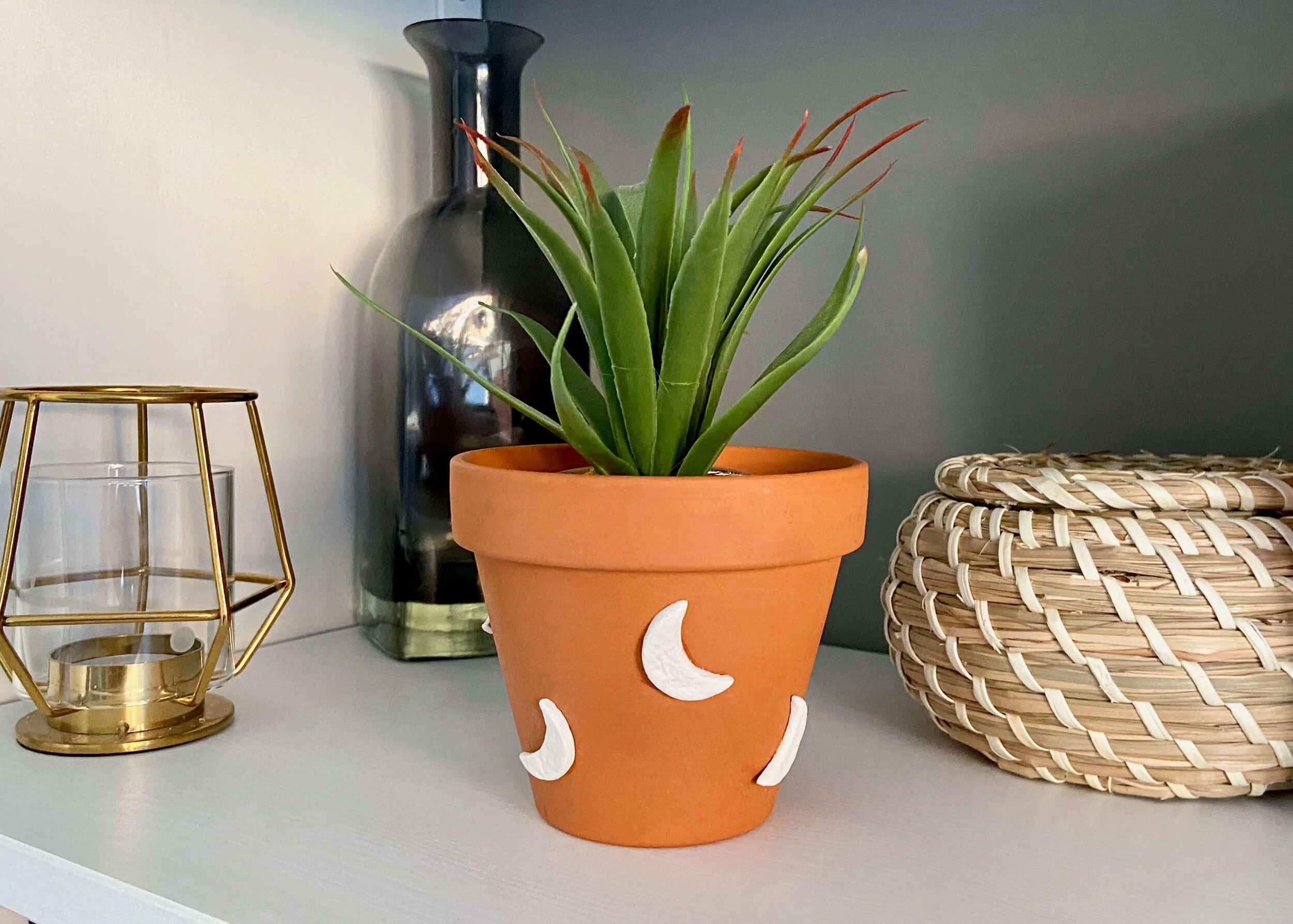 Be sure to clean your pot beforehand, and plan out where you want your moons to be. It’s helpful to put a small pencil mark where you want each moon to go. Once happy with your spacing, stick the moons onto your pot using some superglue or hot glue.