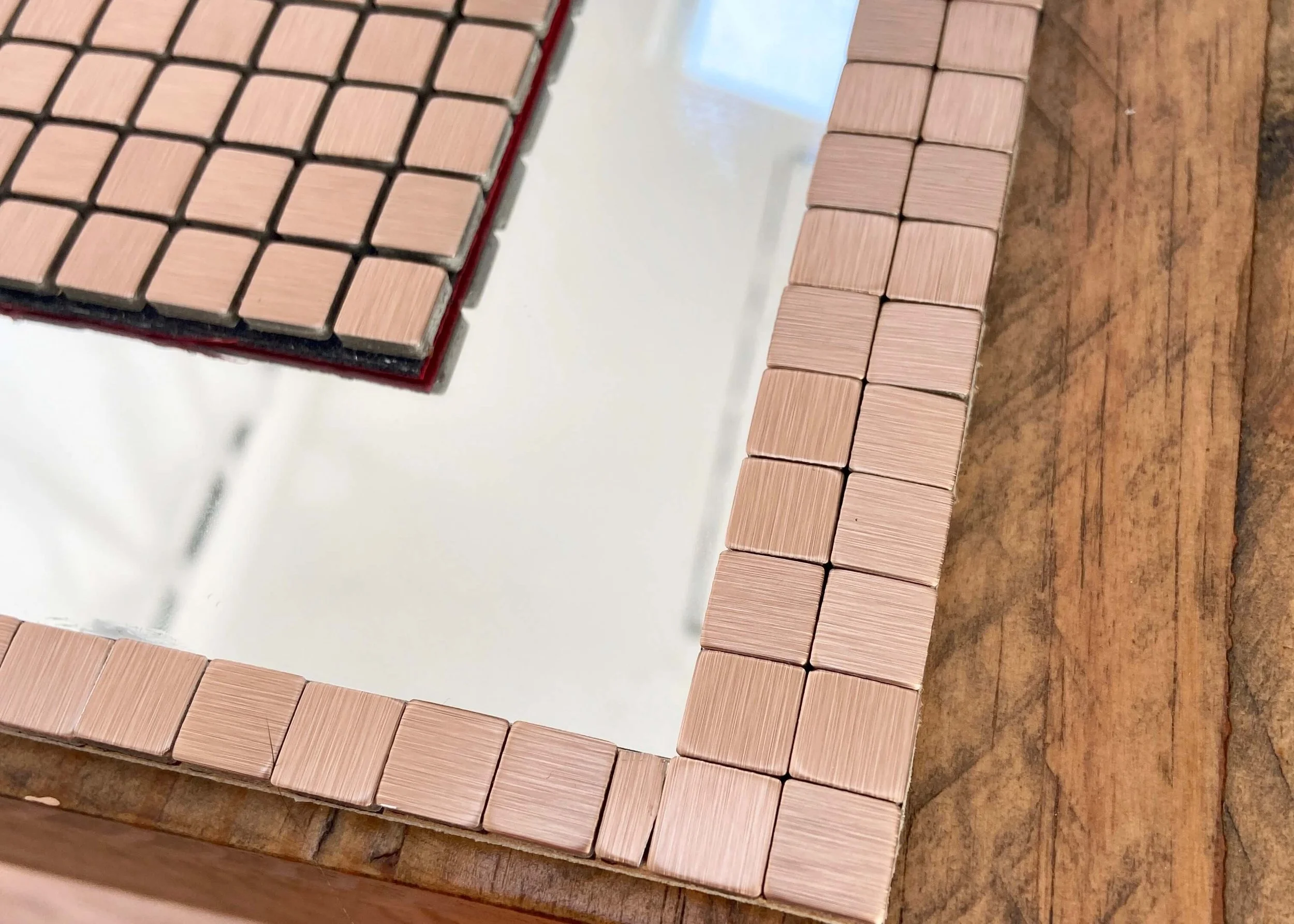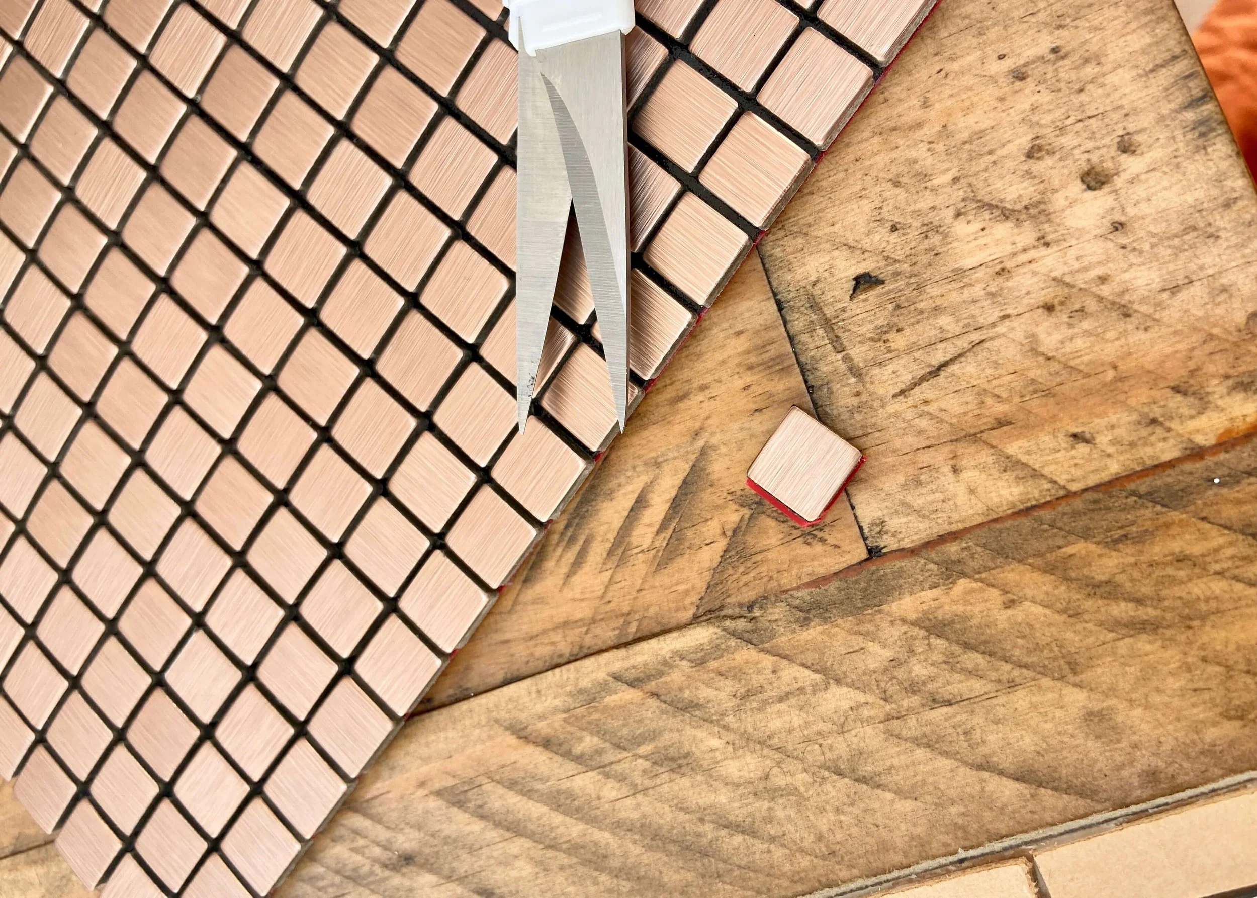 I found these self-adhesive bronze mosaic tiles for my frame, and cut out each individual mosaic tile using scissors and my stanley knife.