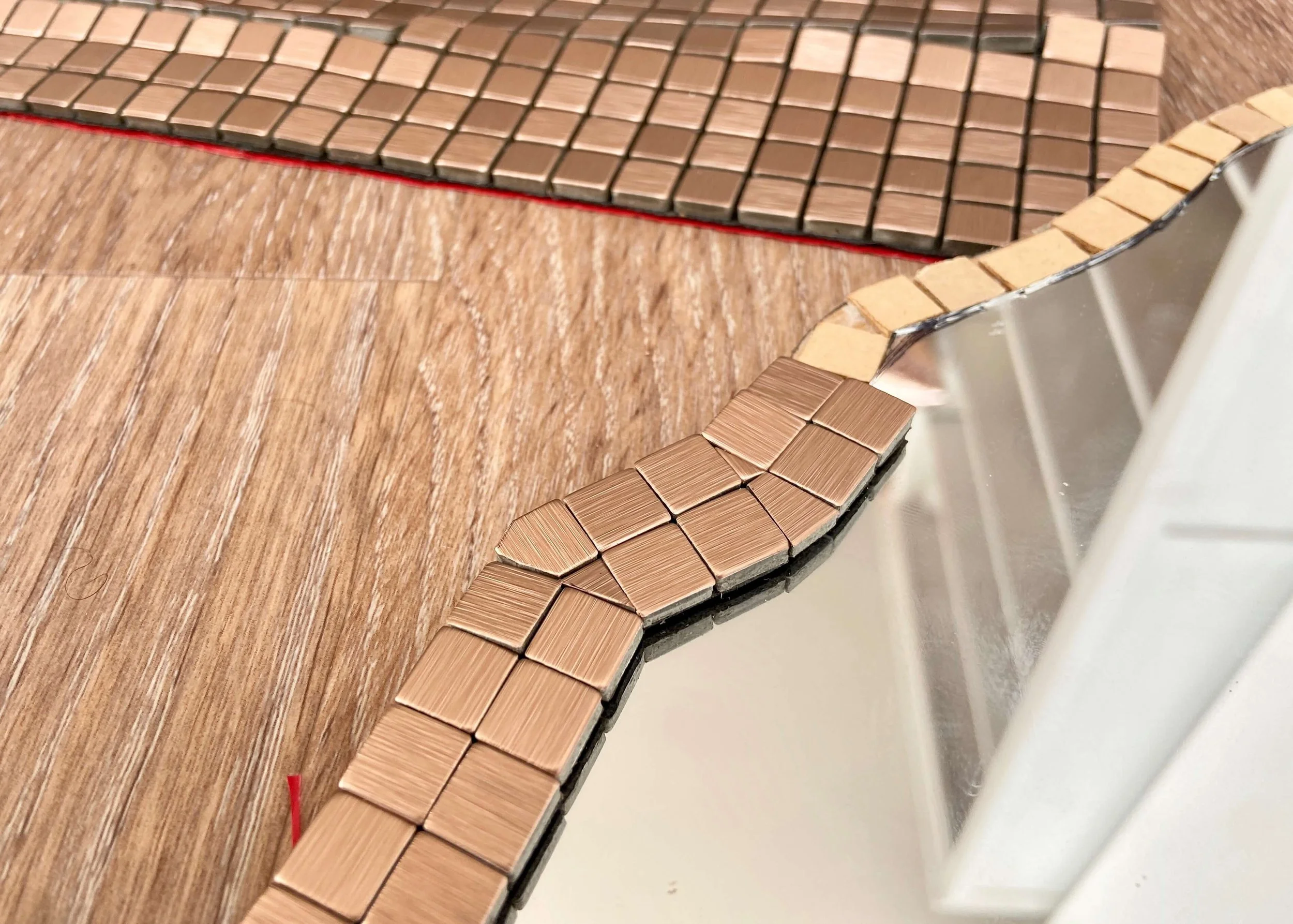 It was quite a quick process sticking the tiles on at the base and sides of the mirror where the edge is straight. Where the mirror was curved, I carefully cut tiles at angles to follow the curves.