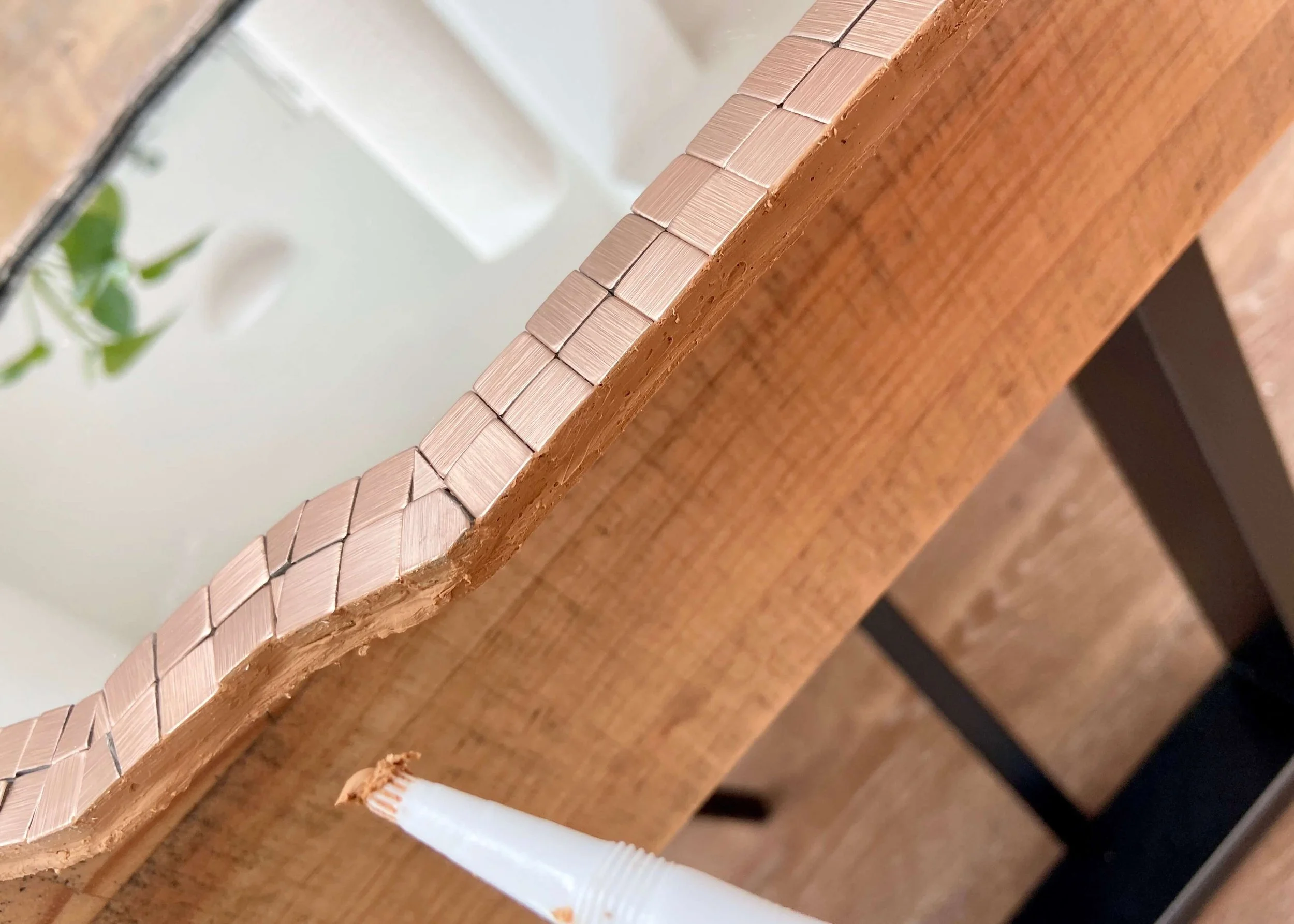 Once I had stuck on all the tiles, I used a similar coloured caulk t neaten up and smooth the edges of the mirror. Where the caulk got on the front of the mirror, I carefully wiped it off.