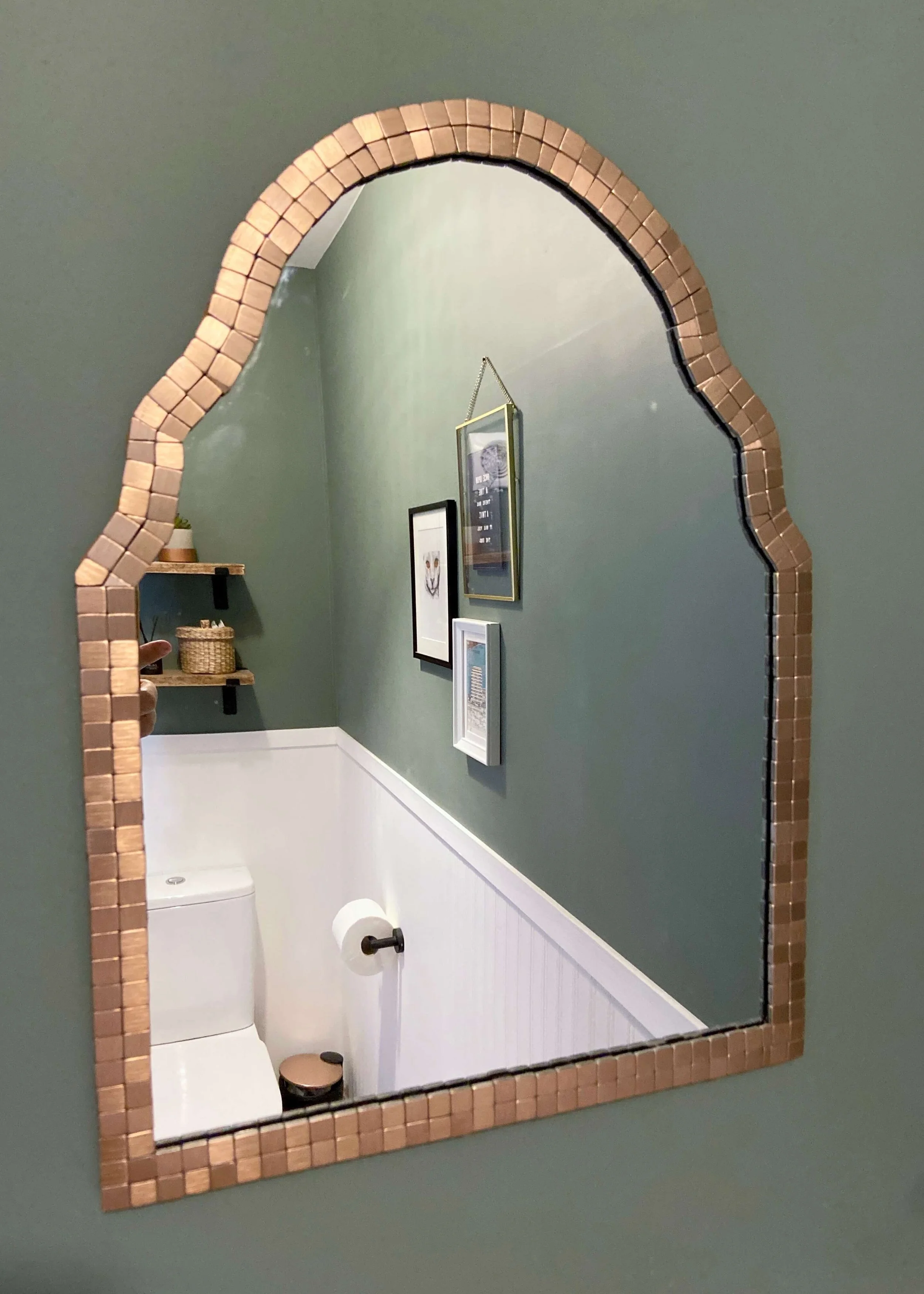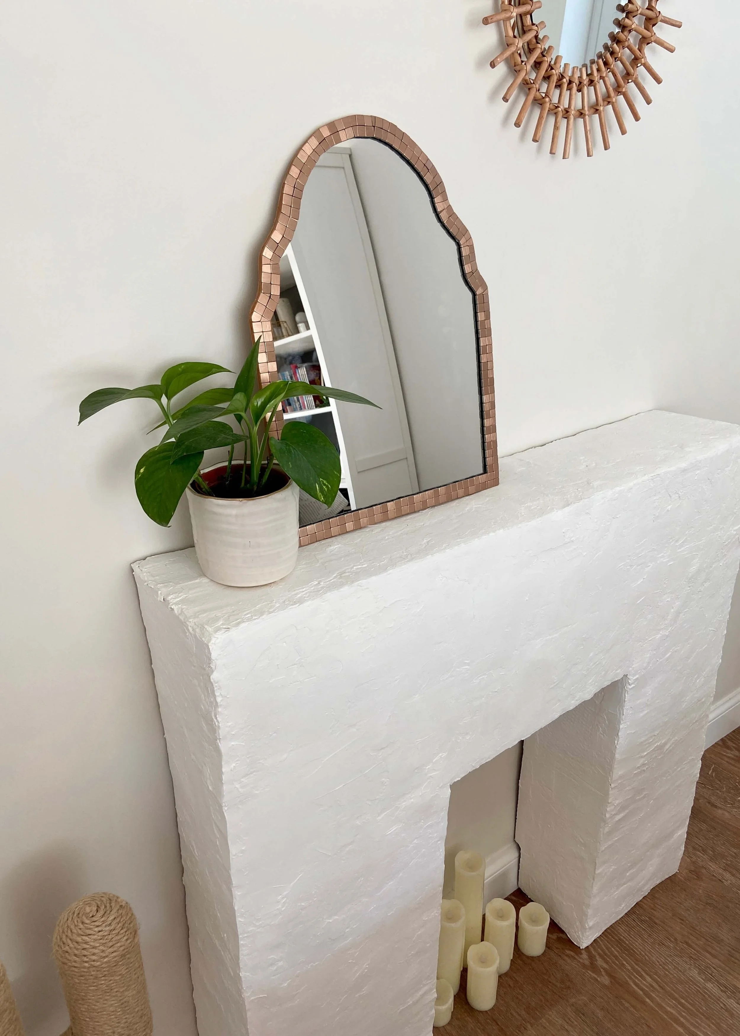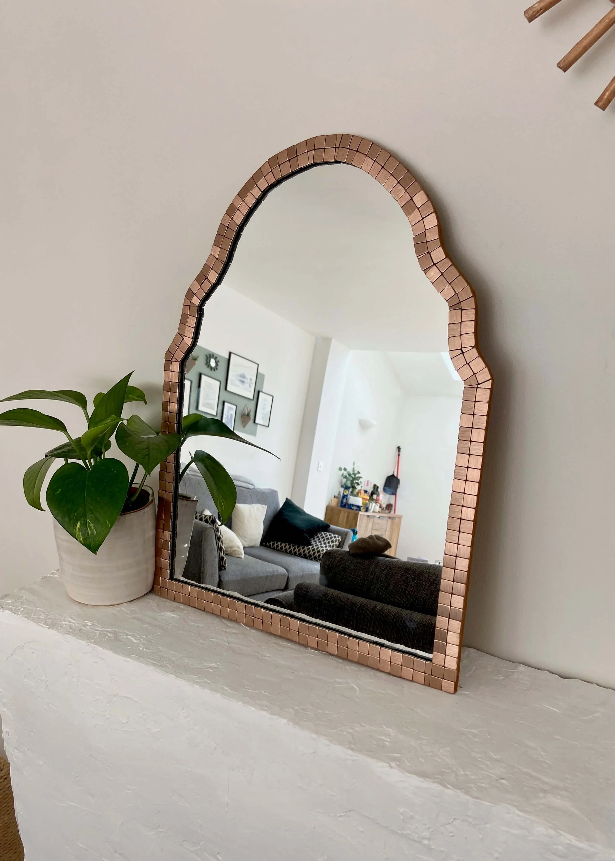 Morocco is by far one of my favourite places to have ever visited and I have long since been in love with it’s architecture and textiles. Recently, I’ve noticed so many shops stocking moroccan style mirrors, which adopt the beautifully detailed arches and curved doorways and details that are characteristic of traditional moroccan architecture. I’ve been looking for some moroccan patterned tiles for the garden and already have a berber rug in the lounge, so when I was looking for a mirror for our cloakroom, this one from Oliver Bonas just made sense. I love how how it adopts the moroccan curved design whilst bringing in hints of art deco with the mirrored tiles. Of course, the bronze version that I wanted was both on sale but out of stock, and so I knew I had to try and make my own version. Keep reading to find out how I made my own version of the organic-shaped mirror…
